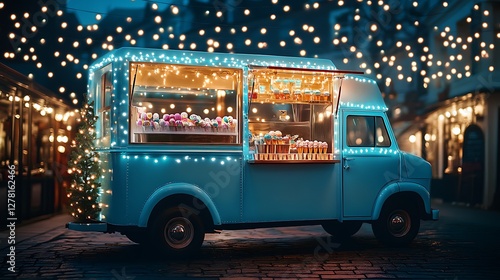 Retro ice cream truck parked under fairy lights