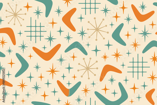 Retro mid-century modern seamless pattern with boomerangs, atomic starbursts, and geometric shapes in teal, orange, and beige on cream background