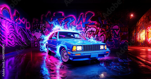 Retro old car in a grungy graffiti covered room with a neon retrofuturistic effect