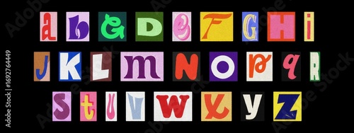 Retro ransom alphabet cut-out collage on black, colorful typography for poster design