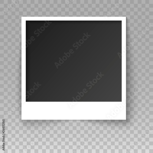 Retro realistic blank instant photo card with shadow effect white border isolated on transparent background. Photo frame. Template photo design. Vector illustration