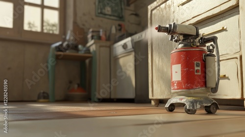 Retro Robotic Spray Painter in Rustic Kitchen Setting