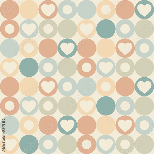 Retro seamless geometric pattern with heart and circle. Valentine's day minimalistic artwork poster. Vector pattern design for web banner, branding package, fabric print, wallpaper