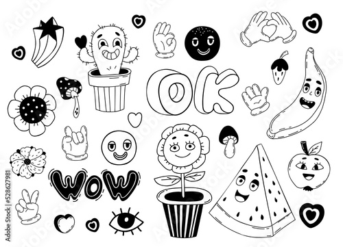 Retro set groovy elements. Funny characters flower power, potted cactus, banana, apple, watermelon, face emotion and gestures comical gloves hands. Vector isolated hand drawn hippie funky doodles.