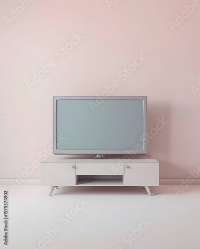 Retro television set on a minimalist cabinet against pastel pink backdrop