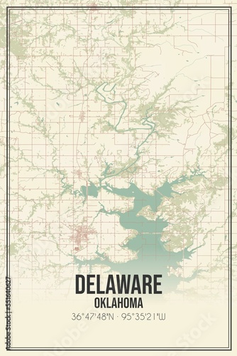 Retro US city map of Delaware, Oklahoma. Vintage street map.