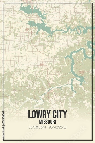 Retro US city map of Lowry City, Missouri. Vintage street map.
