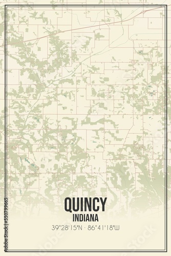 Retro US city map of Quincy, Indiana. Vintage street map.