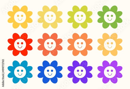 Retro vintage multicolored daisy emoji, print illustration. Children's drawing. Hand drawn, flat design, cartoon. All elements are isolated.