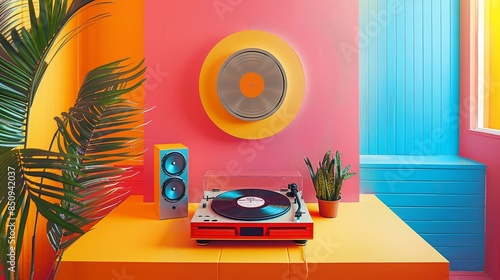 Retro Vinyl Record Player against a Vibrant Colorful Backdrop