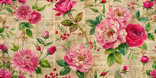 Retro-inspired distressed newspaper collage grunge background featuring vibrant pink floral patterns and beautiful handwritten script, evoking nostalgia and romance.