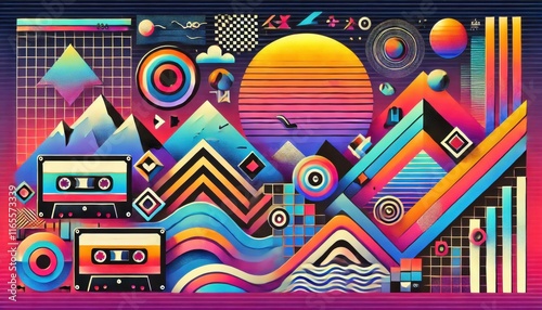 Retro-inspired image with bold colors and geometric patterns, evoking 80s and 90s nostalgia, AI-generated.