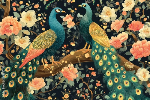 Retro-inspired wallpaper design with vibrant birds, detailed peacocks, and flourishing floral botanical elements in an ornamental layout.