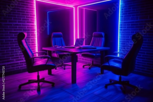 Retro-style podcast room illustration featuring chairs and a central table.
