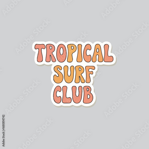 Retro-style sticker design featuring the words "Tropical Surf Club" in orange and peach.
