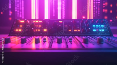 Retrowave objects in neon hues, showcasing a retro-futuristic look with 1980s elements, rendered in comic book style