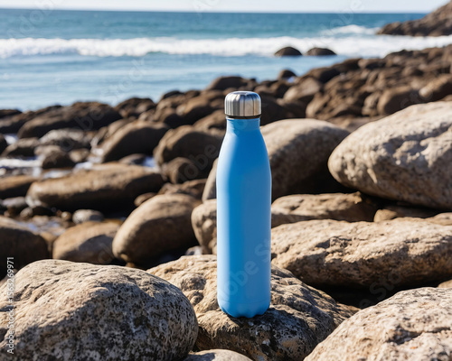 Reusable Water Bottle on Rocks by the Ocean