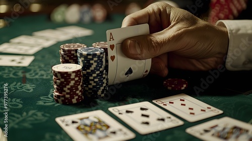 Revealing the River Card: The dealer revealing the river card in a poker game, chips and cards in play.