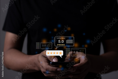 Review Excellence, Young Man hand holding Smart Phone with five star to review and give 5 stars with very good results in service, Good review 5 star rating choice feedback