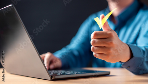 review, satisfaction, vote, positive, feedback, quality, decision, result, voting, check. A man is giving a thumbs up on a laptop. The thumbs up gesture suggests approval or satisfaction.