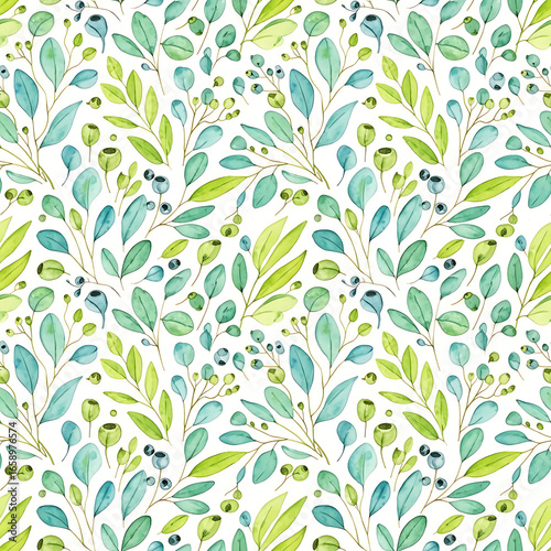 Revitalize Your Designs Now: Serene Teal Watercolor Botanical Pattern with Lush Leaves and Berries for Instant Fresh Vibes