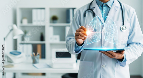 Revolutionizing Lung Health: Doctor with Tablet Displaying Luminous Lungs. Advanced Pulmonary Care & Respiratory Solutions. Discover Innovative Treatments & Diagnostics