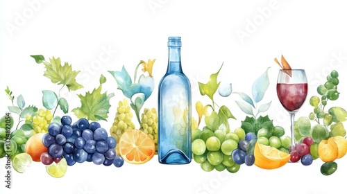 Reward Yourself Day Colorful fruit and wine set with blue bottle and grapes