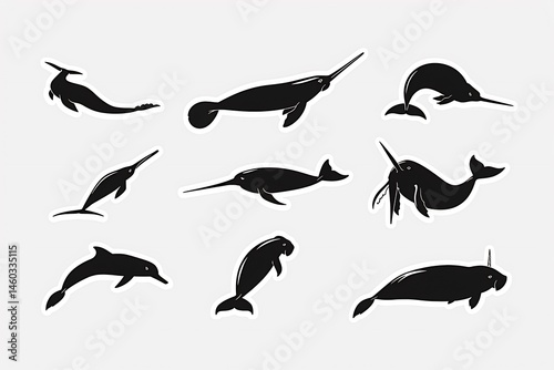 rgb sheet style ocean mammal silhouettes Manatee Dugong Walrus Beluga Narwhal clean vector shapes main color Sticker
