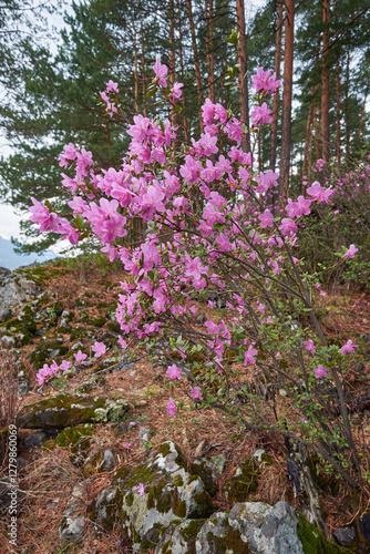 Rhododendron dauricum bushes with flowers in altai pine forest.