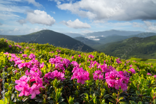 Rhododendron flowers covered mountains meadow in summer time. Beauty sunrise light glowing on a foreground. Landscape photography