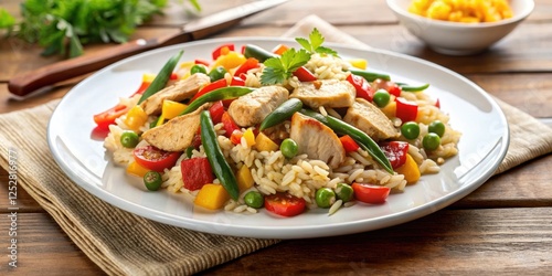 Rice and chicken stir-fry with colorful vegetables on a white plate , food, meal, delicious, healthy, Asian cuisine, dinner