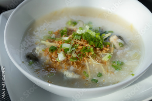Rice congee with soft-boiled egg flavor with pickled chili vinegar and ground dried chilies