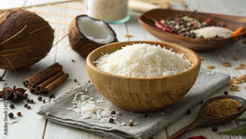 Rice in Bowl with Coconut and Spices on Wooden Table
