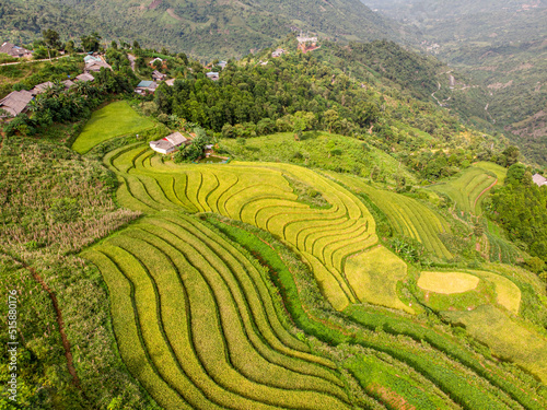 Rice on the terraced fields are ripe yellow interspersed with villages in Lao Cai, Vietnam