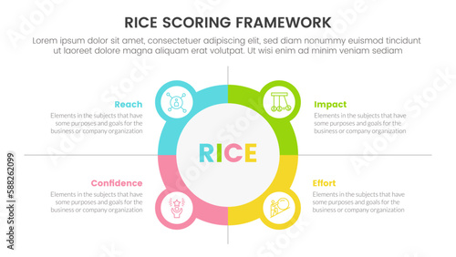 rice scoring model framework prioritization infographic with circle and icon combination information concept for slide presentation