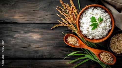 Rice Served in Wooden Bowl with Uncooked Grains on Table