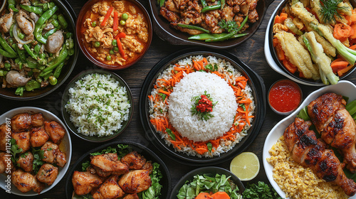 Rice with meat and vegetables, top view of hearty meal featuring chicken, healthy and delicious restaurant style asian food for dinner or lunch cuisine.