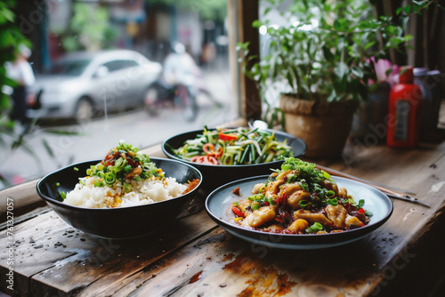 Rice with stir-fried squid and chilli on wooden table