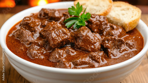 Rich and Hearty Beef Stew with Fresh Herbs and Crusty Bread Served in a White Bowl on Rustic Wooden Table with Warm Background