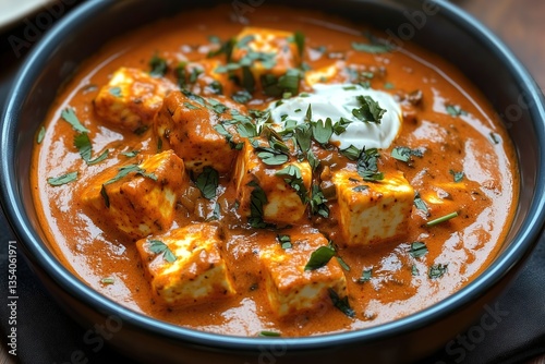 Rich and Velvety Paneer Lababdar - Deep Orange Tomato-Based Gravy with Cream Swirl, Indian Curry