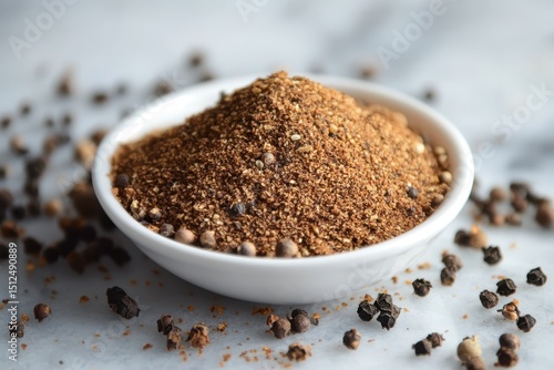 Rich blend of garam masala spices served in a white bowl with scattered whole spices on a marble surface