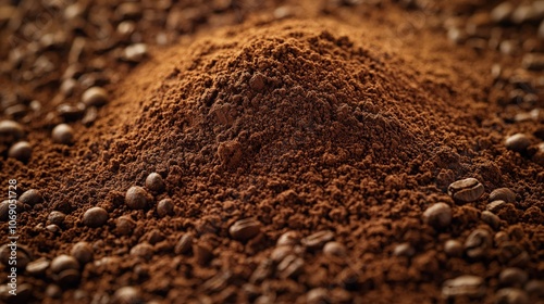 Rich brown coffee grounds on a textured surface with whole beans scattered around