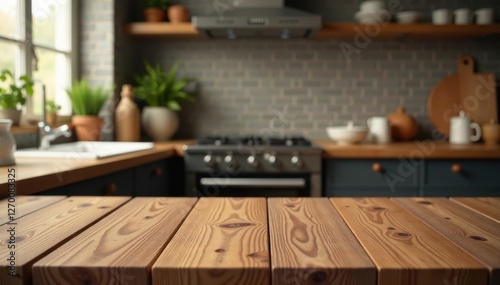 Rich brown wood surface; soft-focus kitchen setting, light, detail