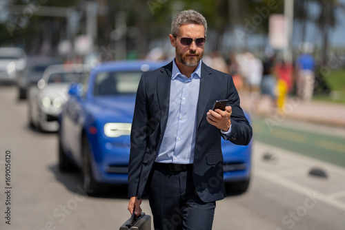 Rich business man near a luxury car. Rich businessman in suit outdoors. Successful rich business man in city. Businessman with a confident look. Success business and rich. Businessman walk on street.