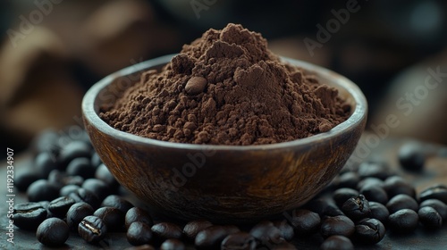 Rich Chocolate Powder in Rustic Bowl Surrounded by Coffee Beans