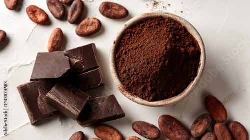 Rich Dark Chocolate and Cocoa Powder Surrounded by Cocoa Beans on Light Background