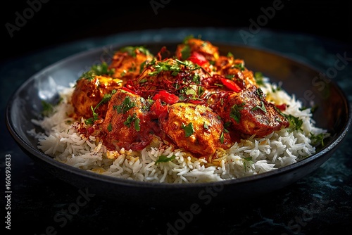 Rich, dark plate brimming with vibrant egg curry, garnished, on fluffy white rice