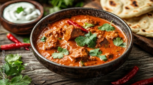Rich flavorful butter chicken curry in bowl with chili peppers and naan on wooden surface