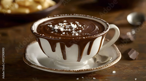 Rich hot chocolate drizzled with caramel and garnished with sea salt.
