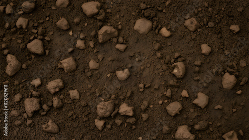 Rich, moist soil texture with visible organic particles, small roots, and a dark brown tone, ultra-clear 8K